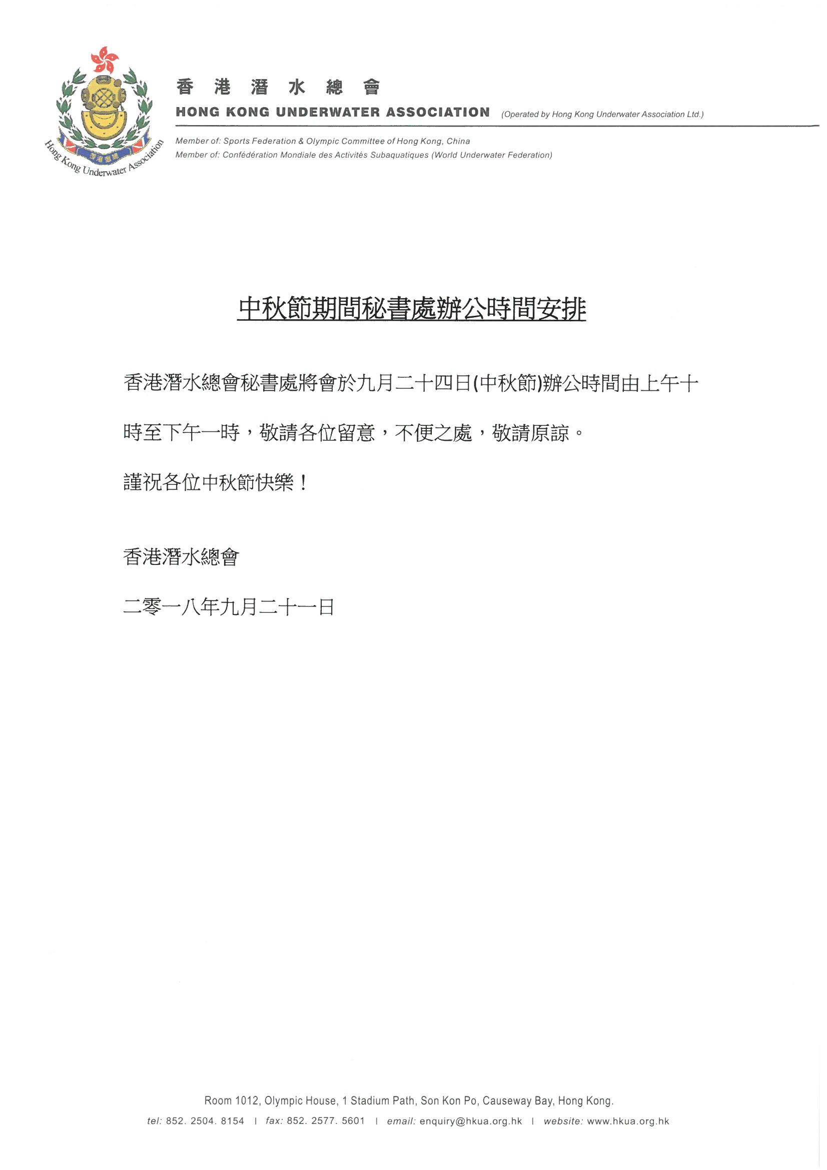 中秋節期間秘書處辦公時間安排2018
