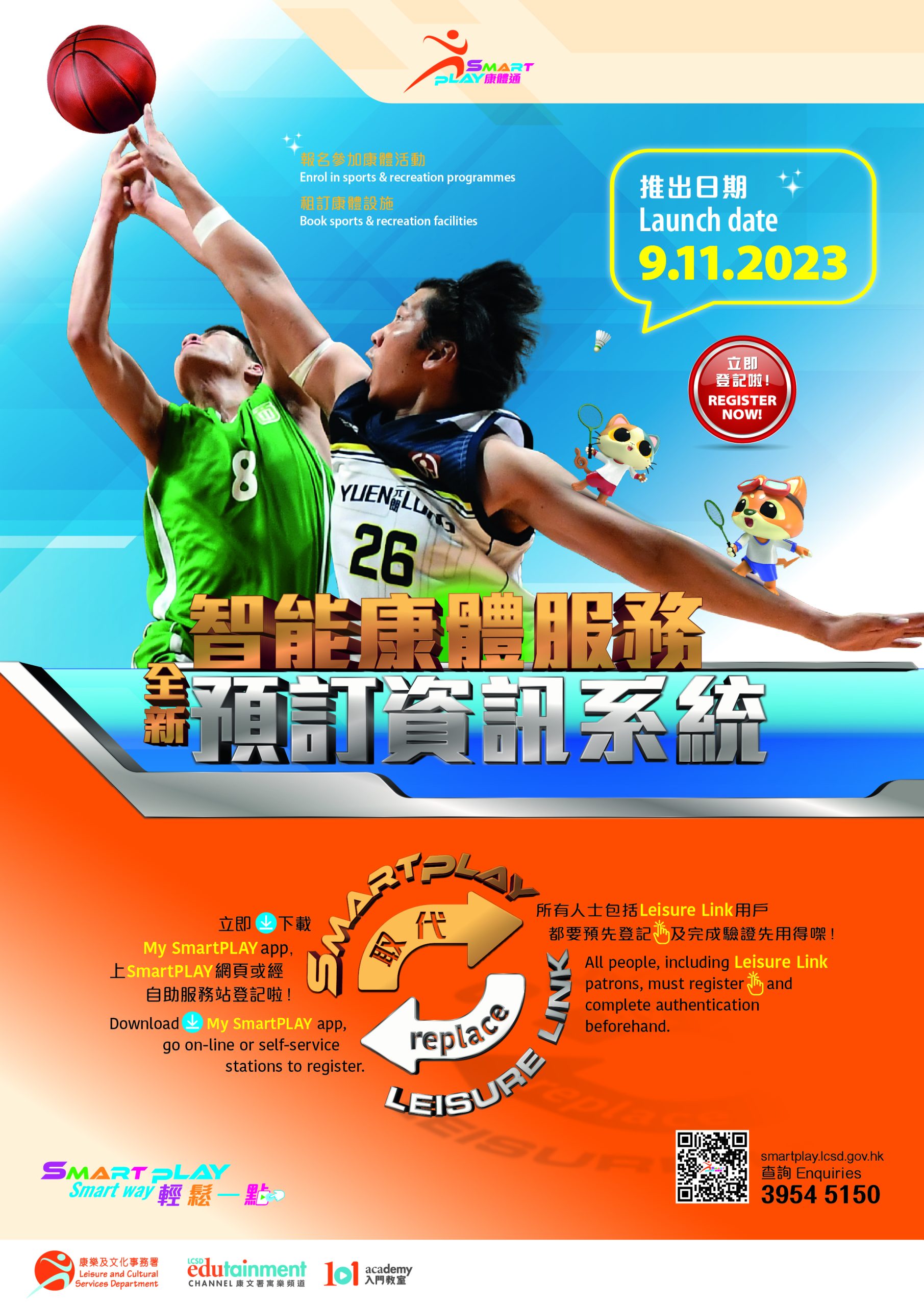 全新智能康體服務預訂資訊系統SmartPLAY(將沿用目前「康體通」中文名稱)11月9日上午7時正式啓用,取代現有Leisure Link系統。Leisure Link在11月6日起停止運作。所有人士必須預先登記及完成認證,方可使用SmartPLAY系統報名參加活動和租訂設施;現有的Leisure Link用戶亦須重新登記。為鼓勵市民盡快登記成為用戶,康樂及文化事務署(康文署) 舉辦有獎推廣活動,所有於11月5日或以前成功登記成為SmartPLAY用戶,並最終完成身分認證的市民(包括現時已登記的二十一萬名SmartPLAY用戶),均會自動獲得抽獎資格,有機會獲得豐富獎品。 獎品包括新款智能手機。活動詳情可參閱網站:smartplay.lcsd.gov.hk/website/tc/news/10015.html。